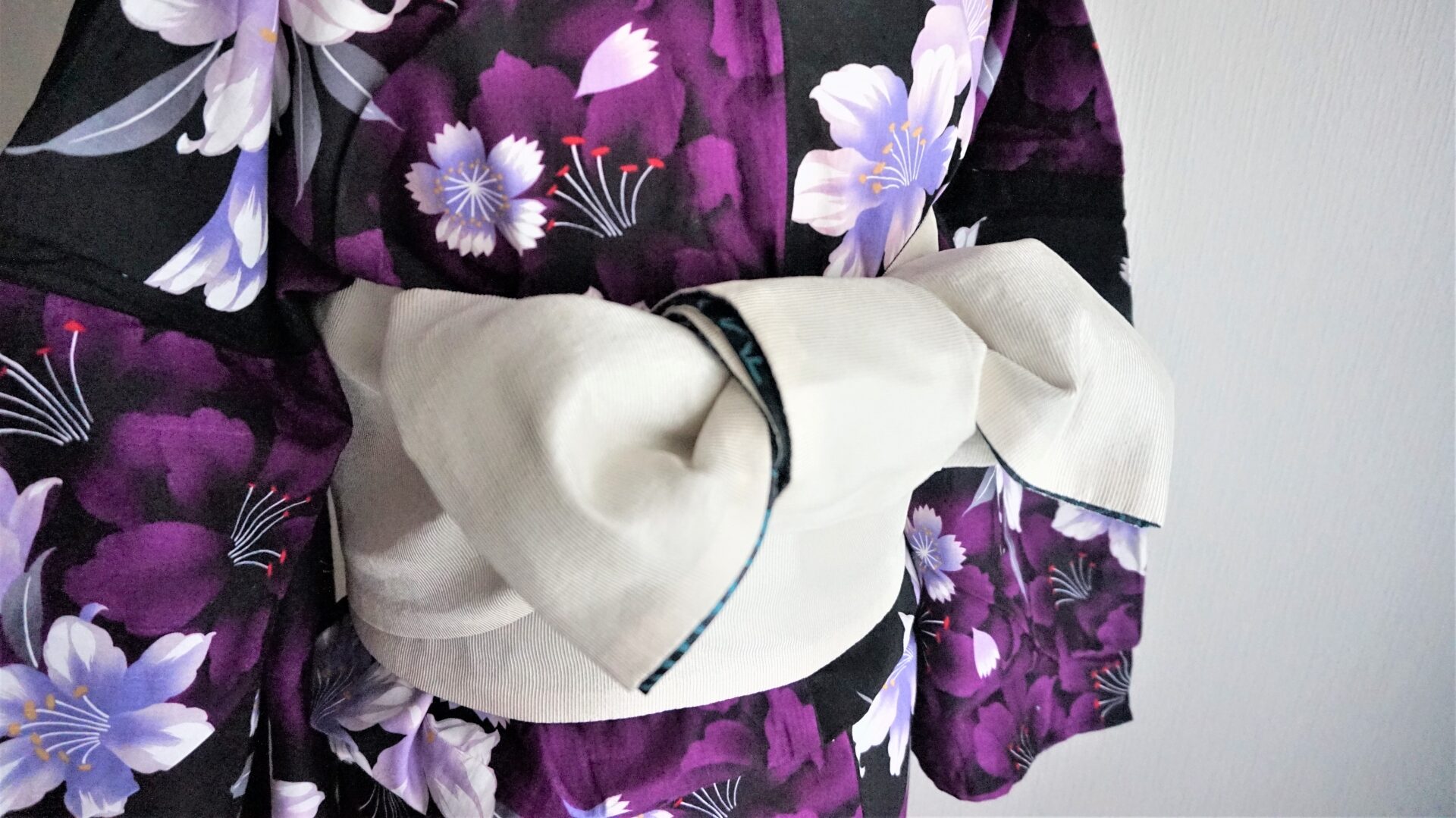 新幹線でしっかり背もたれによりかかりたかったので、帯結びはかるた結びにしていました。